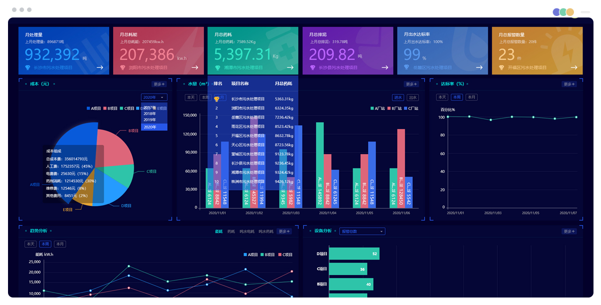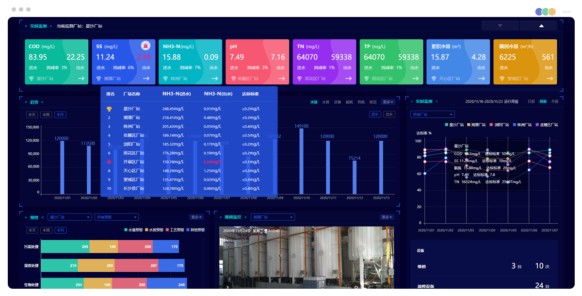 筛选项目下厂站进行数据统计、分析,在百度Echart及定制化图形界面基础上,嵌入第三方视频平台数据,实时监控厂站运行情况