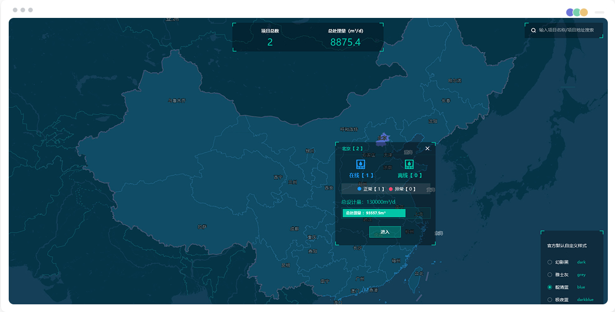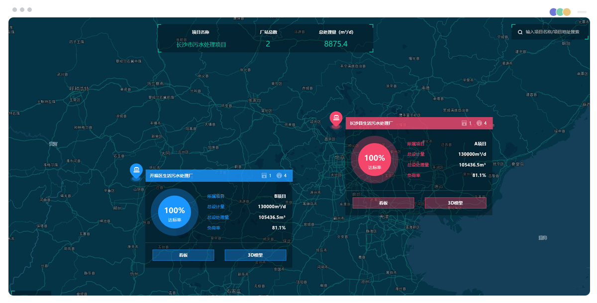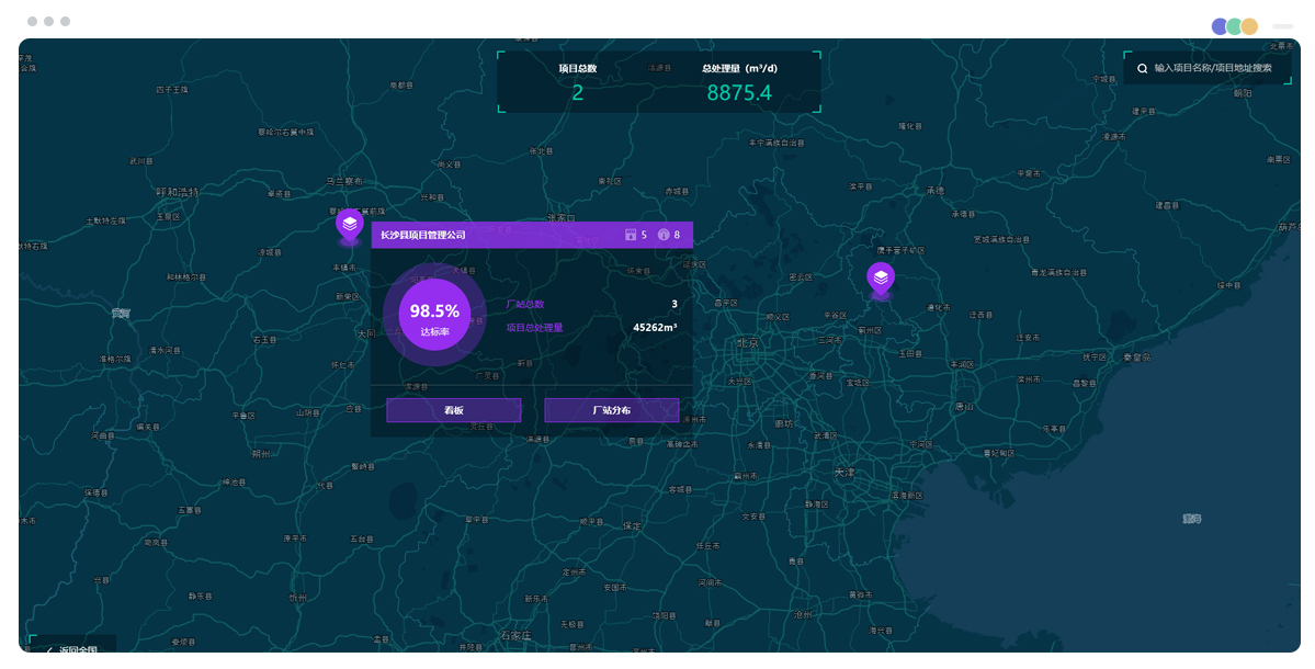 采集项目公司点位,在地图上进行展示,同时各点位会显示项目当前运行情况、实时数据、项目介绍等。